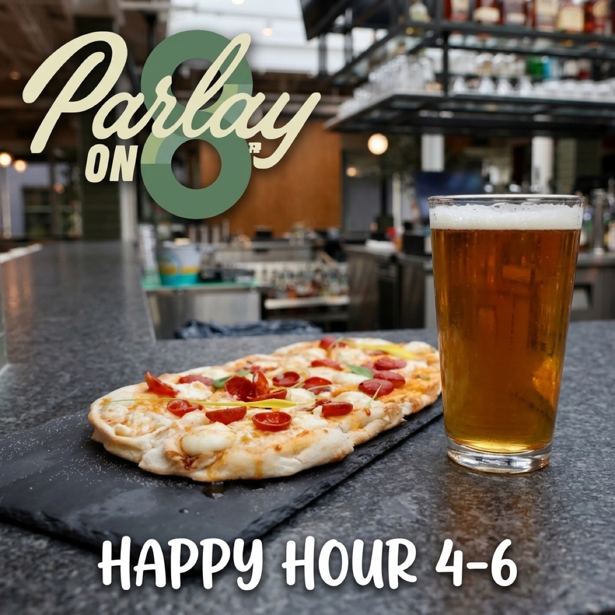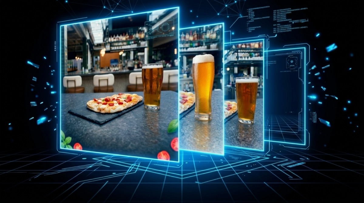 Uses your flatbread plate, beverage glass, and ambient lighting references to land a warm, social tone without reshooting.