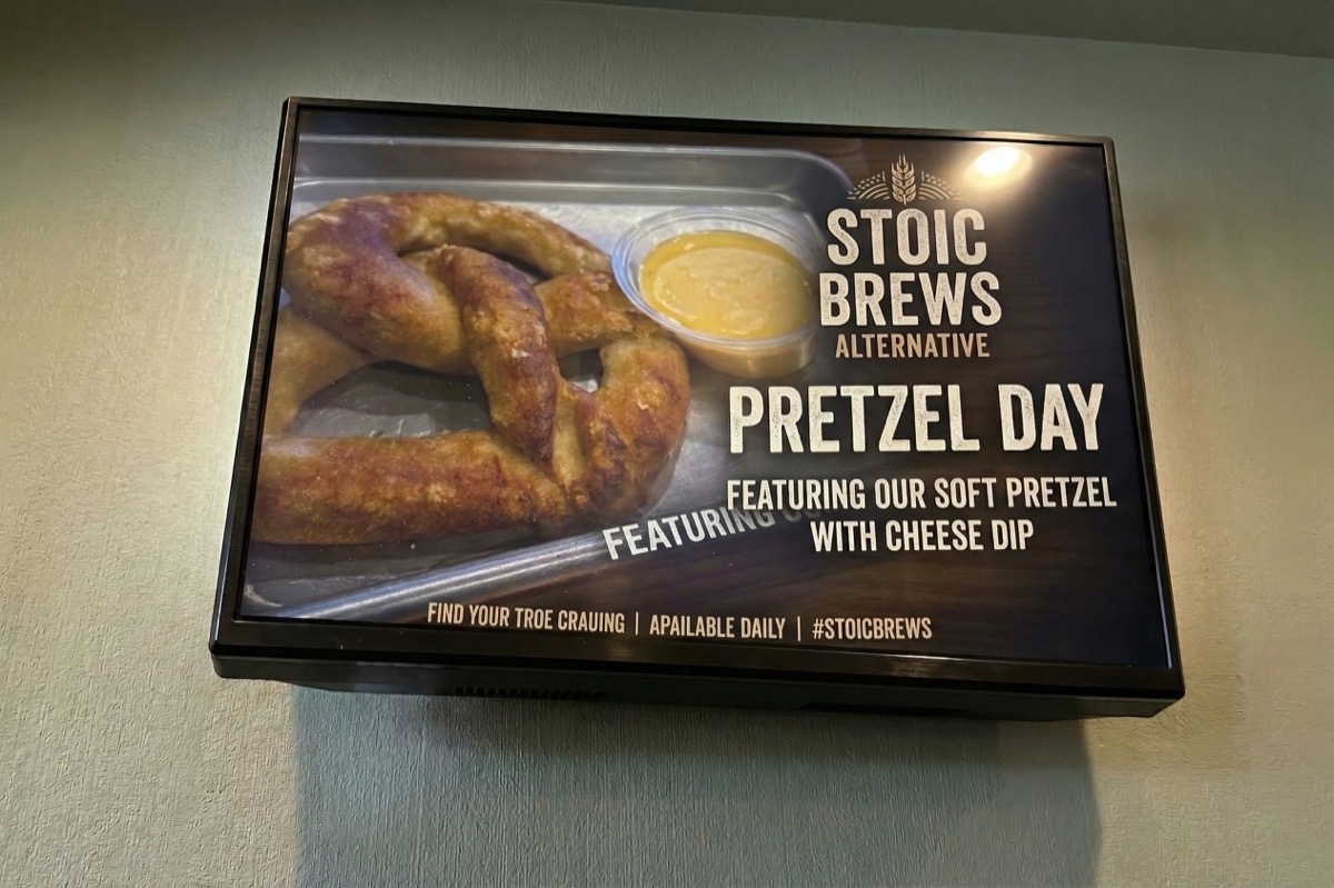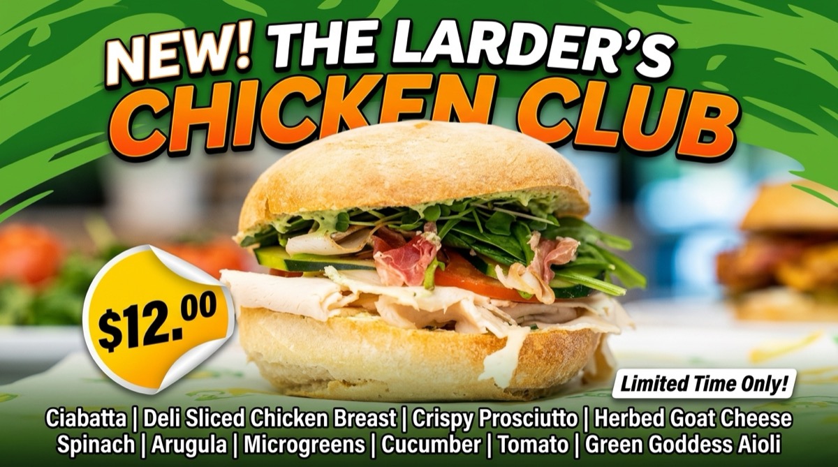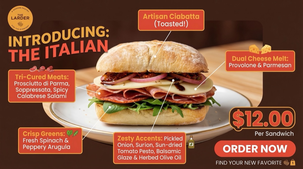 Merges signage, sandwich hero, and brand type samples so time-sensitive messaging stays on-brand across channels.