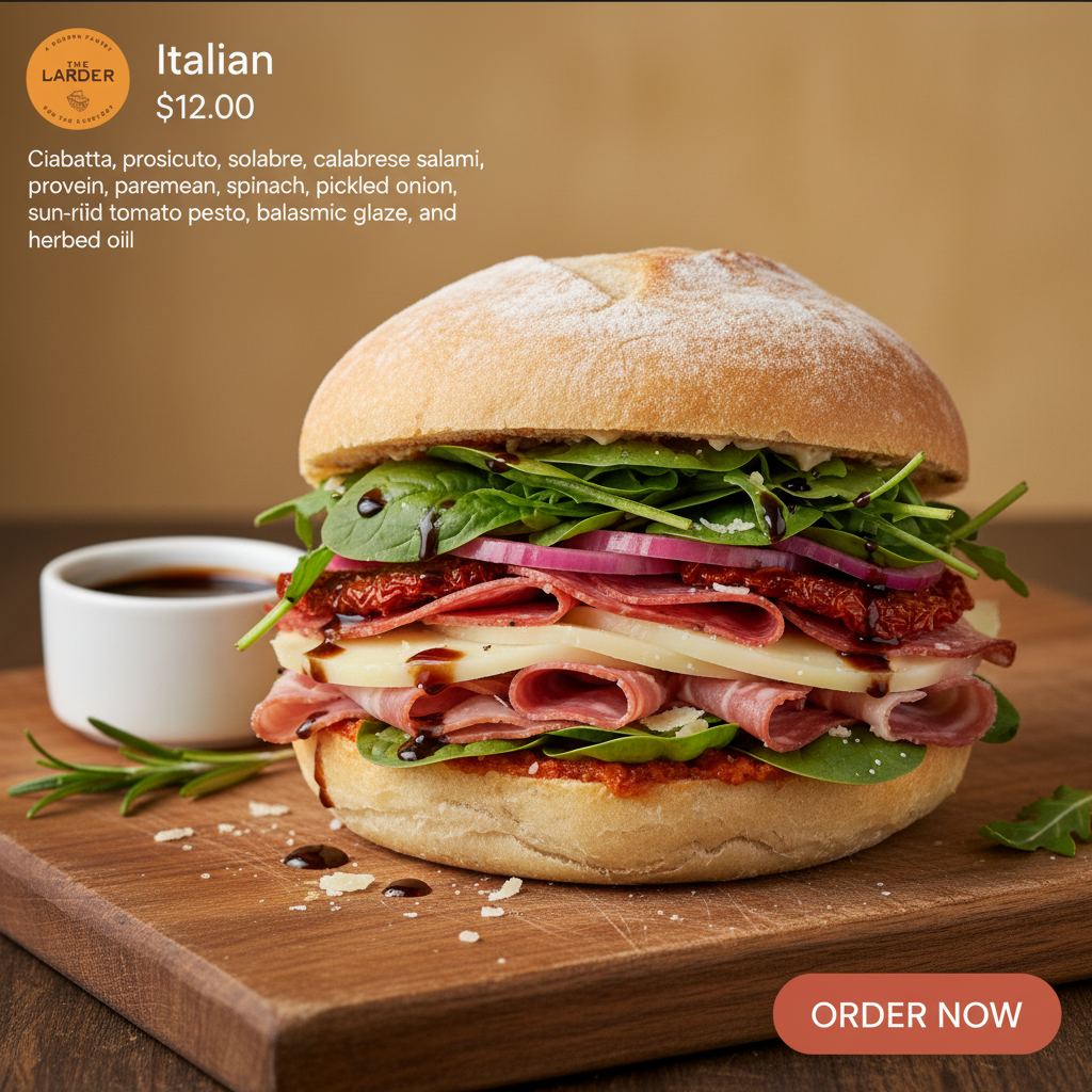 Stacks bread, protein, and garnish references with a campaign frame from your gallery so the bite looks consistent everywhere.